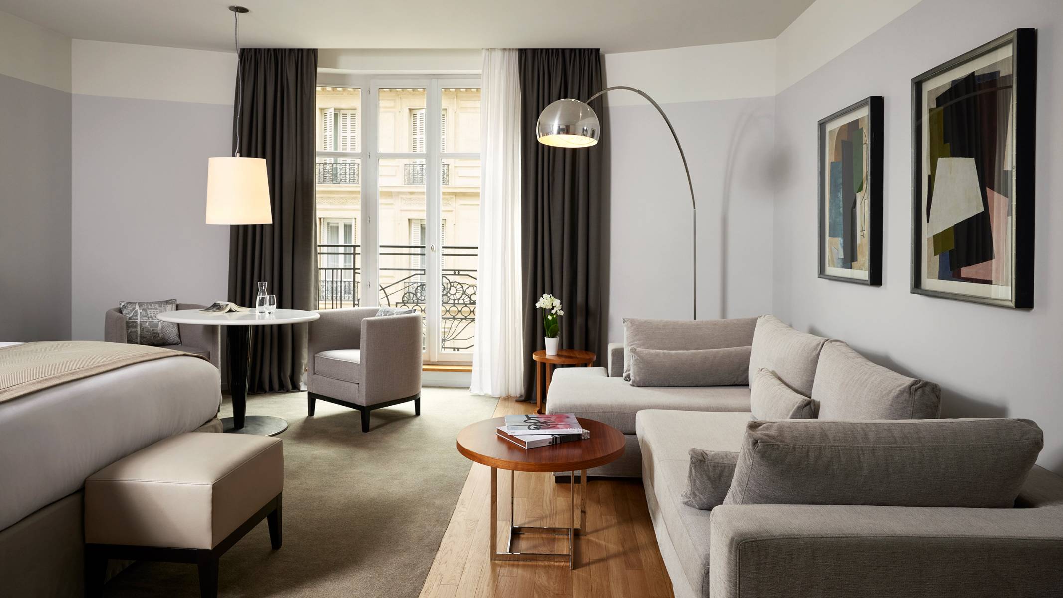 Every detail has been carefully thought out to give you a feeling of calm in the heart of bustling Paris: shades of ivory, beige and pearl gray; natural materials; bedside tables giving off restful blue light at bedtime – and on the wall, a quote from Andrée Putman to welcome you to your room: